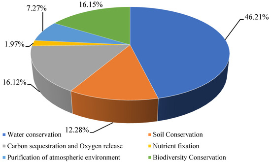 The ESV was assessed based on six environmental benefits, including the following: water conservation (flood regulation and water quality improvement), soil conservation (reduction in soil erosion), carbon sequestration and oxygen release, nutrient retention, air quality improvements, and biodiversity improvements.
