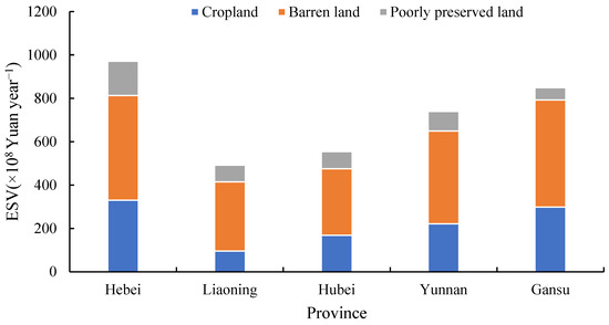 Ecosystem services value of different land sources in the five provinces.