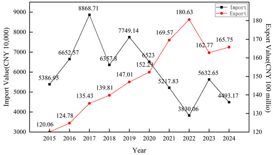 A macro-level analysis of China’s bamboo product trade from 2015 to 2024 (Figure 1) shows distinct trends for imports and exports. Imports exhibited significant year-to-year fluctuations with an overall downward trend, declining from CNY 53.87 million in 2015 to CNY 44.93 million in 2024, a 16.58% decrease. The highest import value was recorded in 2017 (CNY 88.69 million), while the lowest was in 2022 (CNY 38.30 million), reflecting a 56.81% range of fluctuation. This downward trend in fluctuations reflects the continuous improvement of China’s bamboo industry’s self-supply capacity, with domestic bamboo resource cultivation and processing capacity gradually meeting market demand, thereby reducing reliance on imported bamboo products [45].