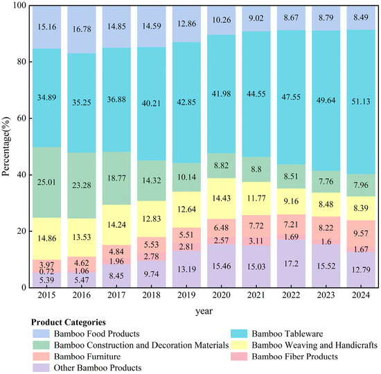 On the export side, Bamboo Tableware became the dominant category, rising from 34.89% of exports in 2015 to 51.13% in 2024. This surge aligns with the global Bamboo as a Substitute for Plastic movement and the inclusion of Bamboo Tableware as a key product in China’s Three-year Action Plan to Accelerating the Development of Bamboo as a Substitute for Plastic [49]. Simultaneously, exports of Bamboo Food Products, Bamboo Construction and Decoration Materials, and Bamboo Weaving and Handicrafts declined. Notably, Bamboo Construction and Decoration Materials dropped from 25.01% in 2015 to 7.96% in 2024, a 17.05 percentage-point decrease. This trend may signal waning international demand or enhanced domestic production capabilities in those segments.