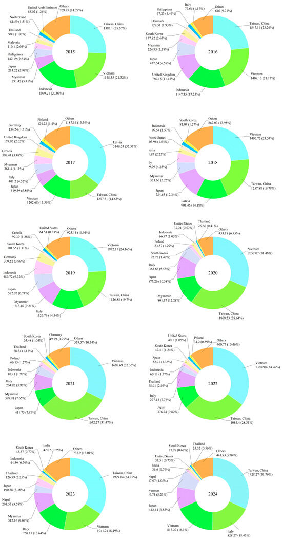Figure 4 and Figure 5 present China’s top ten bamboo product trade partners from 2015 to 2024 in terms of trade value and share. On the import side, China’s Taiwan, Vietnam, and Japan consistently ranked among the top three, collectively accounting for over 40% of imports with upward trends. Vietnam’s share peaked at 31.5% in 2020, while China’s Taiwan’s reached 31.8% in 2024, underscoring the strong competitive positions of these suppliers. In line with Figure 1, China’s bamboo product imports have shown a steady decline since 2015, reflecting not only the gradual enhancement of domestic production capacity but also a sustained reduction in reliance on imports. During this period, strengthened cooperation with major sourcing regions such as China’s Taiwan, Vietnam, and Japan has improved coordination within the import supply chain. This, in turn, has helped mitigate risks associated with fragmented import categories and enhanced processing efficiency across the industry.