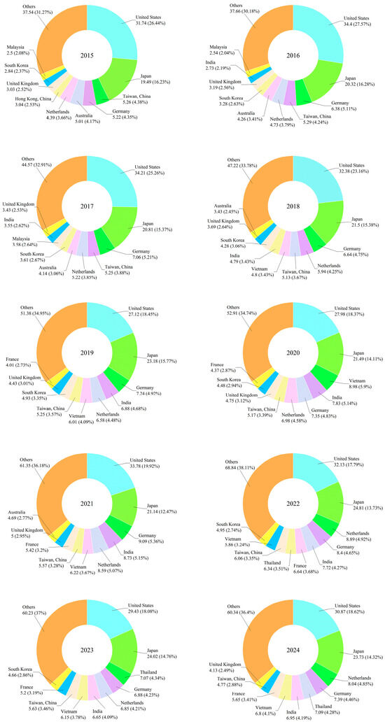 On the export side, the United States and Japan consistently held the top two positions over the past decade. European countries such as Germany, The Netherlands, and the United Kingdom, along with China’s Taiwan, also ranked in the top ten, forming a stable export market base (Figure 5). While the combined export value to the United States and Japan rose from CNY 5.12 billion in 2015 to CNY 5.46 billion in 2024, their market share declined from 26.44% and 16.23% to 18.62% and 14.32%, respectively. This trend indicates a diversification of export destinations despite increasing trade value. Germany, The Netherlands, and China’s Taiwan consistently maintained approximately 4% market shares, with limited annual fluctuations. India, Vietnam, and Thailand emerged as key export destinations in 2016, 2018, and 2022, respectively, and together accounted for 12.57% of exports in 2024, signaling the rise in emerging markets in South and Southeast Asia. The combined share of the top ten export markets declined from 68.73% in 2015 to 63.6% in 2024, reflecting a progressive diversification in China’s bamboo export market structure, which enhances the industry’s resilience to external shocks and improves adaptability to global market dynamics.
