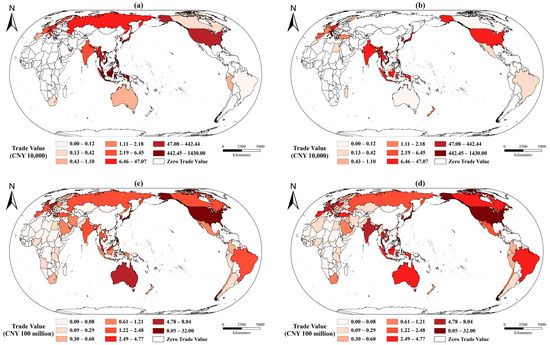 Heatmaps illustrate the spatial distribution of China’s import and export partners in 2015 and 2024 (Figure 7), with color intensity representing trade value. On the import side (Figure 7a,b), the primary sources of imports for Chinese bamboo products are concentrated in Asia, Europe, and North America, while the number of trade partners from Africa and South America has steadily increased. However, as shown in Figure 1, from 2015 to 2024, despite a downward trend in import trade value, the number of trade partners has overall increased. This can be attributed to two factors: on one hand, the deepening of the globalization process has facilitated increasingly frequent trade exchanges among countries; on the other hand, enterprises have actively expanded their import channels to ensure supply stability. Overall, despite the decline in import trade value, the number of trade partners remained stable from 2020 to 2024 (Figure 6), indicating that enterprises are more inclined to establish long-term partnerships with reliable suppliers. This trend reflects a rational result of market-driven choices and continuous supply chain optimization in response to the complex global trade environment.
