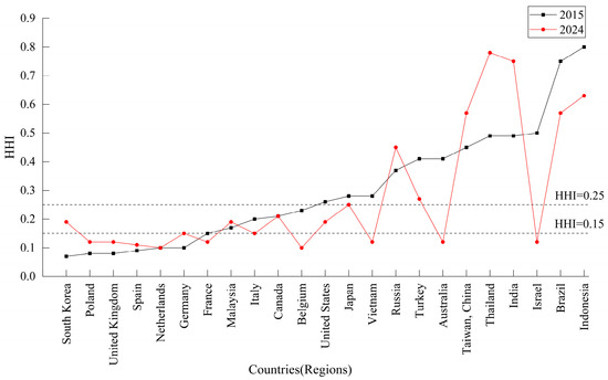 Based on different HHI thresholds, China’s major bamboo product export markets were classified into three categories (Table 2 and Table 3), highlighting structural shifts in market concentration between 2015 and 2024 (Figure 8). Low Concentration Markets (HHI < 0.15) expanded from six countries in 2015 to nine in 2024, indicating balanced and diversified demand structures. Moderate Concentration Markets (0.15 ≤ HHI < 0.25) increased slightly from five to six countries, characterized by some diversity but with specific product categories partially dominant. High Concentration Markets (HHI ≥ 0.25) decreased notably from twelve to eight countries, reflecting highly concentrated demand focused on a few specific product categories. Significant changes in HHI were observed in certain countries: India and Thailand experienced considerable increases of 0.26 and 0.29, respectively, while Australia and Israel recorded substantial decreases of 0.29 and 0.38, respectively. Compared with 2015, the structural adjustment of market concentration in 2024 has led to an overall reduction in trade concentration and a notable improvement in export market resilience.