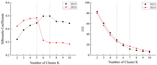 Following dimensionality reduction using Principal Component Analysis, the optimal number of clusters (K) was determined through the Elbow Method and Silhouette Method (Figure 9). The SSE curve exhibited distinct inflection points at K = 7 for 2015 and K = 5 for 2024, corresponding to peak silhouette coefficients of 0.50 and 0.49, respectively. These results indicated well-separated clusters and high internal homogeneity. Consequently, the 23 major export countries (regions) were optimally grouped into seven clusters in 2015 and five clusters in 2024 (Table A1 and Table A2).