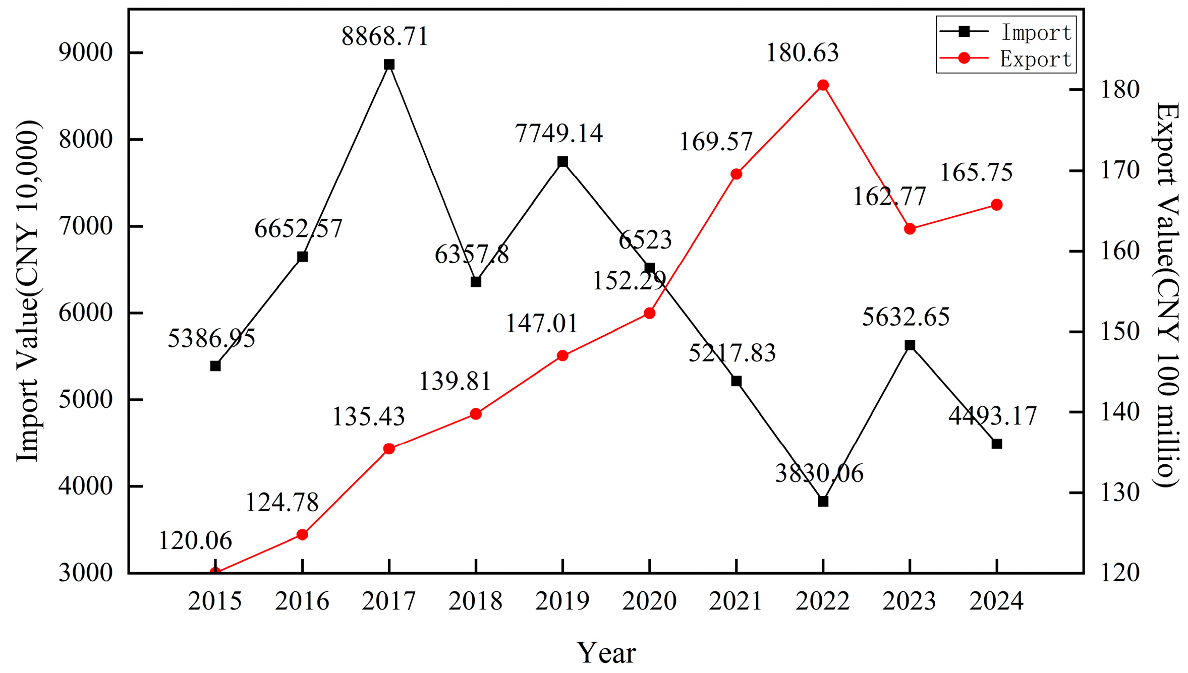3.1. Evolution of China’s Bamboo Product Import-Export Trade Characteristics