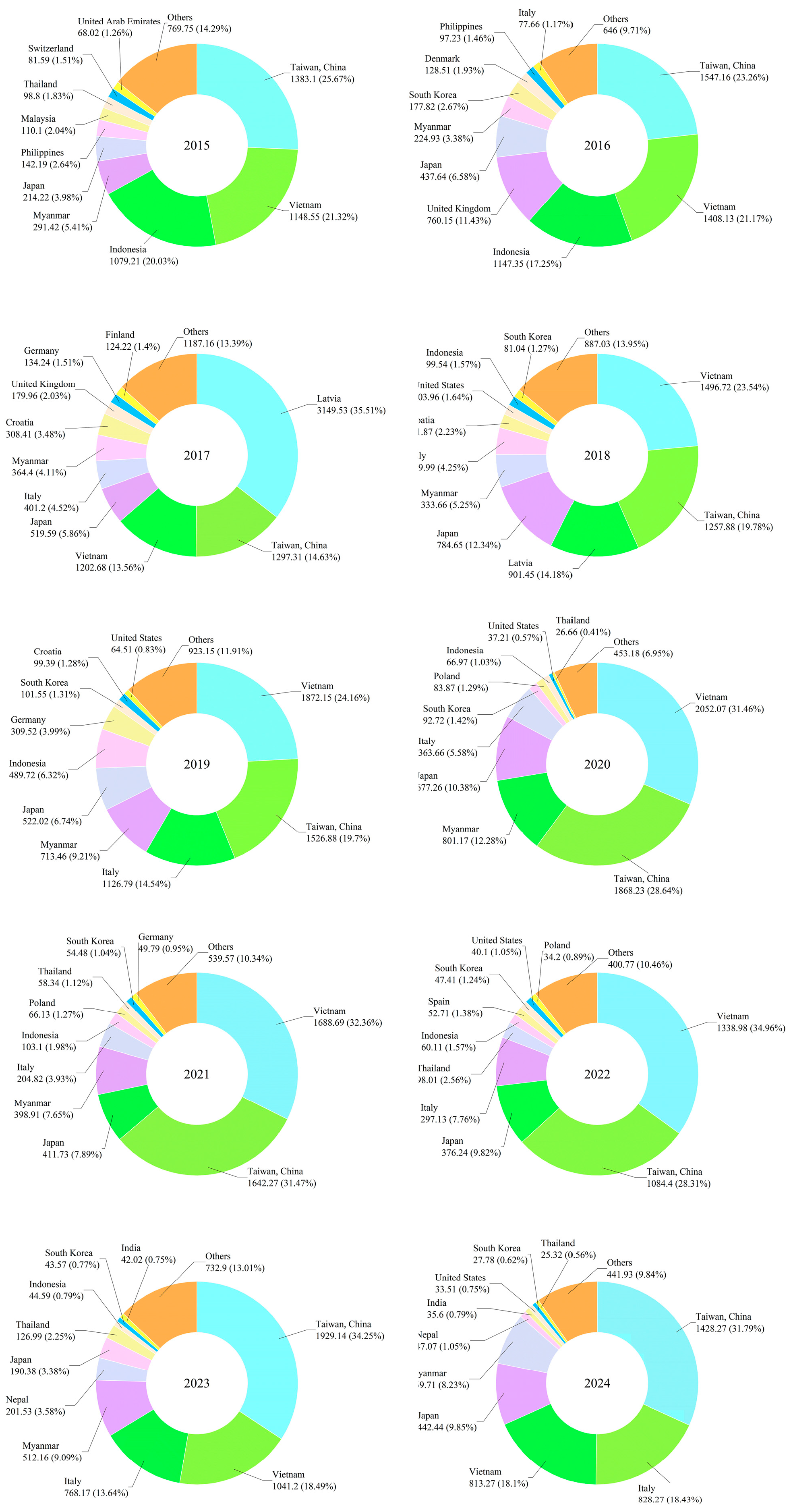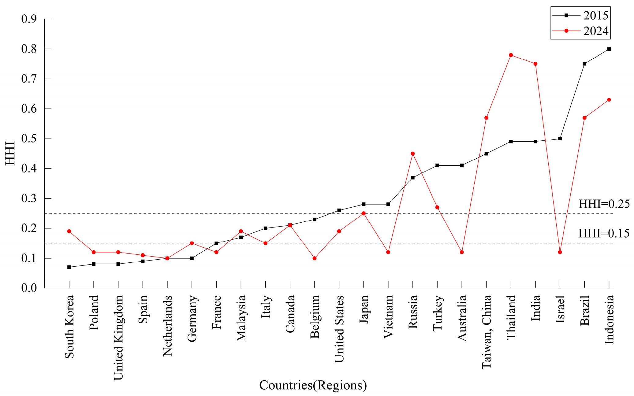 | Country (Region) | Share of Trade Value | Trade Value Ranking | HHI | Concentration Level |