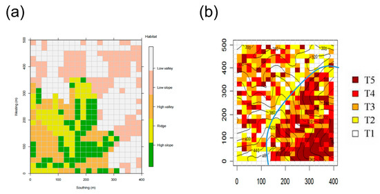 The spatial distribution of habitats and successional stages in the 20 ha DHS FDP. (a) The five habitat types [7]; (b) early-successional (left of blue line) and late-successional (right of blue line) stands—quadrats from youngest to oldest: T1–T5 [25,26].