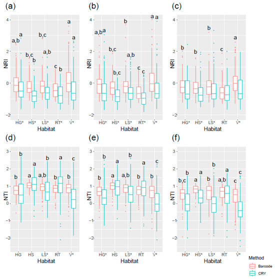 The net relatedness index (NRI) and nearest taxon index (NTI) varied by time and habitat types in 20 m × 20 m quadrats. (a) 2005 NRI, (b) 2010 NRI, (c) 2015 NRI, (d) 2005 NTI, (e) 2010 NTI, and (f) 2015 NTI. Five types of habitats in the DHS FDP including high-gully (HG), high-slope (HS), low-slope (LS), ridge-top (RT), and valley (V) were classified by Pei et al. [7]. Lowercase letters indicate significant differences among the habitat types, and * symbols indicate significant differences between two methods (p < 0.05). The box plots show the median (center line) and the 25th and 75th percentiles (box boundaries), and the whiskers extend to 1.5 times the interquartile range from the box. Data points beyond the whiskers are considered outliers and are plotted individually.
