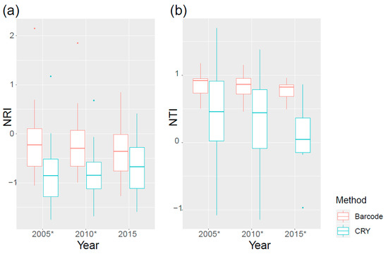 The NRI (a) and NTI (b) of a larger spatial scale (100 m × 100 m). * symbols indicate significant differences between two methods (p < 0.05). Data points beyond the whiskers are considered outliers and are plotted individually.
