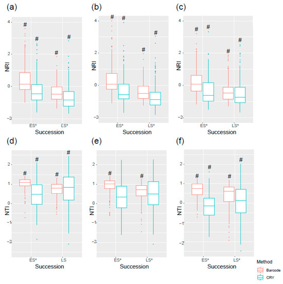 The NRI and NTI varied by successional stages of forest. (a) 2005 NRI, (b) 2010 NRI, (c) 2015 NRI, (d) 2005 NTI, (e) 2010 NTI, and (f) 2015 NTI. # symbols indicate significant differences between successional stages and * symbols indicate significant differences between two methods (p < 0.05). Data points beyond the whiskers are considered outliers and are plotted individually.