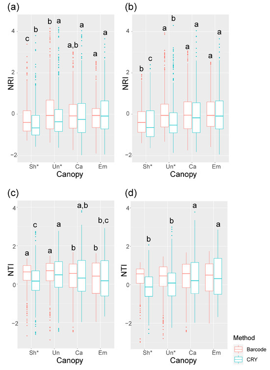 The NRI and NTI varied by canopy layers. (a) 2010 NRI, (b) 2015 NRI, (c) 2010 NTI, and (d) 2015 NTI. The results of 2005 census cannot be calculated because lack of height data. Different lowercase letters above columns indicate statistical differences (p < 0.05). * symbols indicate significant differences between two methods (p < 0.05).