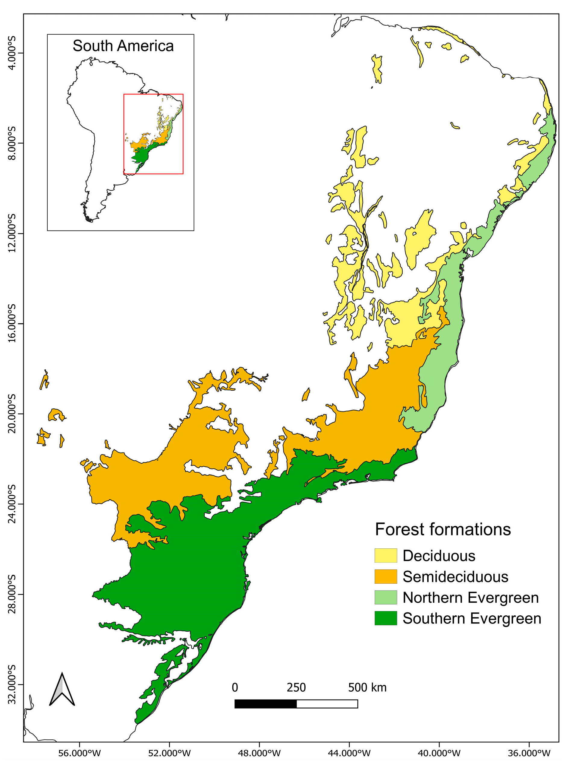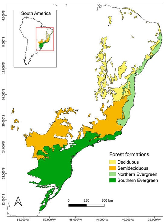 - Klipel, J.; Bergamin, R.S.; Esquivel-Muelbert, A.; Lima, R.A.; Oliveira, A.A.; Prado, P.I.; Müller, S.C. Climatic distribution of tree species in the Atlantic Forest. Biotropica 2022, 54, 1170–1181. [Google Scholar] [CrossRef]
