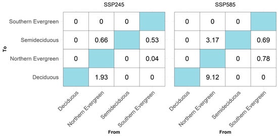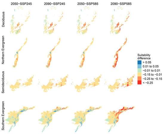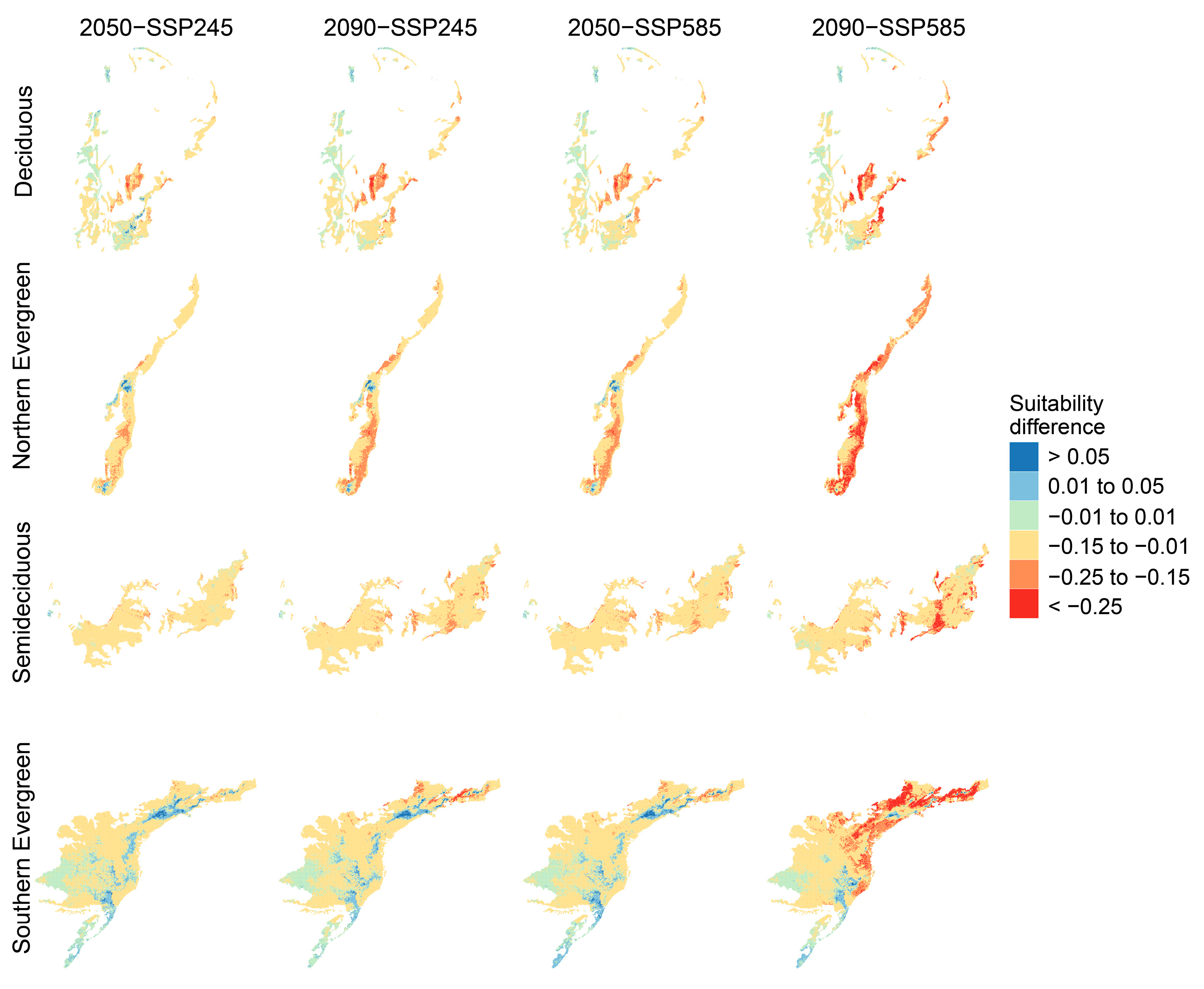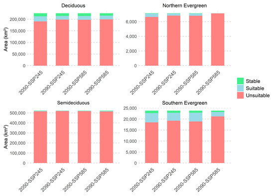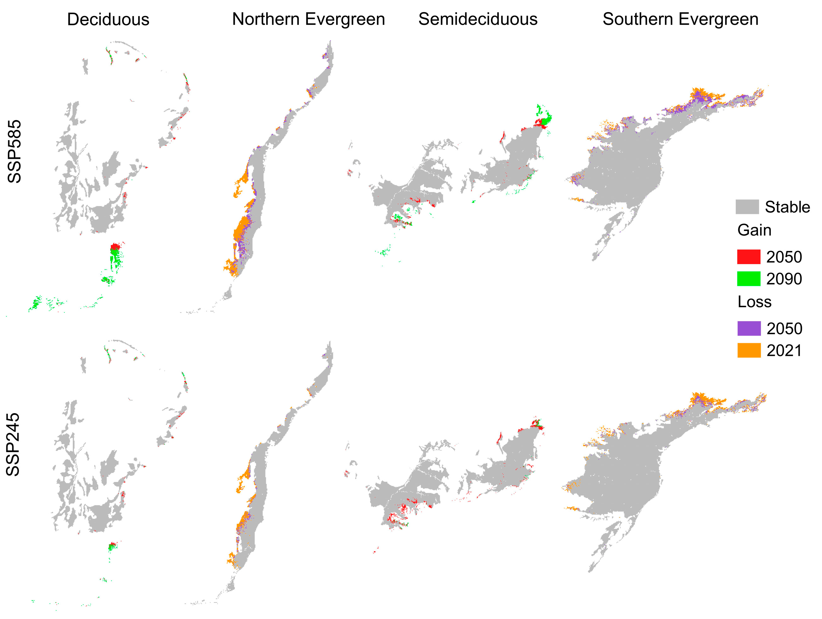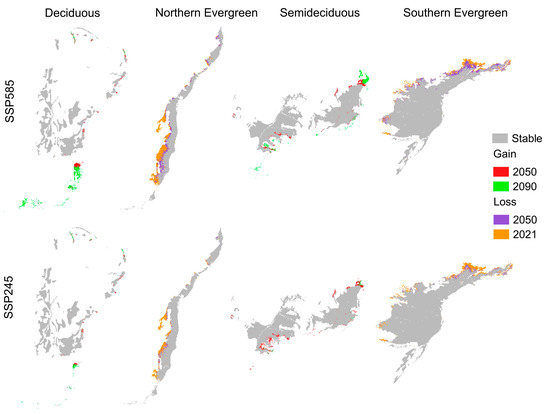| Forest Formation | 2050 | 2050–2090 | 2090 | 2050 | 2050–2090 | 2090 |
