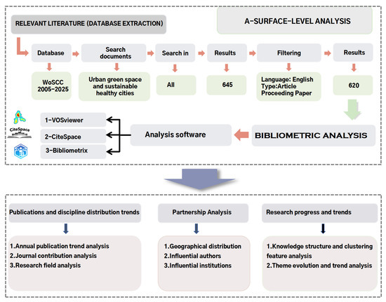 Urban planning and policy-making agencies increasingly regard Urban Green Spaces (UGSs) as essential infrastructure for fostering sustainable and healthy cities [17,18]. Early research primarily focused on the ecological benefits and environmental regulatory functions of urban green spaces—such as mitigating the urban heat island effect, improving air quality, and supporting biodiversity [19,20]. Subsequently, scholarly attention shifted toward the social and health effects of urban greenery [21]. Jabbar et al. [22] found that urban green spaces are closely associated with physical, psychological, and social well-being; Wolch, [23] from the perspective of environmental justice, proposed the “just green enough” strategy to prevent green gentrification; and Lee et al. [24] and Konog et al. [25].emphasized the importance of public demand and perception of green spaces in enhancing quality of life In recent years, research has further expanded to encompass climate adaptability and innovations in urban governance [26]. For instance, Lehmann [27] discussed “renaturalization” and “rewilding” as strategies for strengthening urban resilience, while Chen [28] proposed an integrated, multidimensional framework for sustainable urbanization. Overall, these studies reveal the multifaceted roles of UGSs in sustainable urban development [29,30]. However, from a research content perspective, existing literature largely concentrates on single dimensions—such as health effects, ecological performance, or green justice—lacking a systematic understanding of the multi-objective and multi-scalar coupling relationships among them [31,32,33]. From a methodological perspective, most studies rely on case studies or traditional reviews, with limited systematic quantitative analyses and knowledge-map visualizations based on large-sample data [34,35].This limitation constrains a comprehensive depiction of the field’s developmental structure and thematic evolution. In terms of research scope, despite the abundance of regional and national studies, systematic efforts to identify the global knowledge base, disciplinary networks, and frontier trends of UGSs and sustainable healthy cities remain scarce [36,37].
