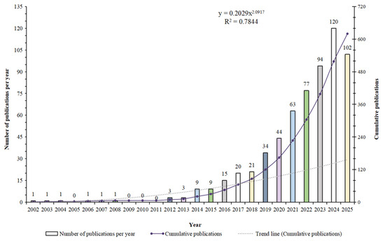 In terms of cumulative publication volume, the total reached 620 articles by 2025, exhibiting a typical exponential growth trend. The fitted results indicate that the growth curve conforms to y = 0.2029x2.0917, with a coefficient of determination R2 = 0.7844, suggesting that research in this field has undergone