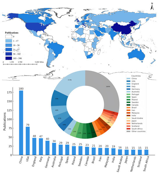 Analyzing the global publication landscape of urban green space and sustainable healthy city research at the national level helps to reveal the degree of international academic participation and the leading forces in this field. Figure 3 illustrates the number of publications and their geographical distribution across countries. As shown, China is by far the leading contributor, with 180 related publications, accounting for 17.9% of the global total. This indicates its international leadership in promoting the integration of green city construction and the healthy city concept. The United States ranks second with 79 publications (7.9%), reflecting its sustained focus on urban health and its strong capacity for multidisciplinary integration. The United Kingdom (48 publications, 4.8%), Italy (47 publications, 4.7%), and Germany (40 publications,4.0%) follow closely, suggesting that developed European countries also maintain a solid research foundation and policy-driven momentum in this area.