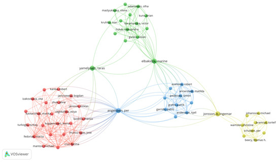 The green cluster, centered on Marine Elbakidze, includes scholars such as Olha Adamenko, Ruslan Gunko, and Victor Karamushka from Ukraine and Eastern Europe. This group is characterized by close cooperation and high network density, reflecting the collective scientific strength of this region in ecological governance and green space research. The red cluster, represented by Bogdan Jaroszewicz and Robert Kanka, primarily consists of researchers from Central and Eastern European countries and displays a dense, strongly connected network structure. Additionally, the yellow cluster, centered around K. Ingemar Jonsson along with Christine Wamsler and Thomas H. Beery, forms a relatively independent collaborative network.