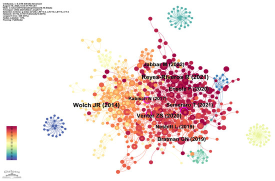 Co-citation analysis is employed to uncover the knowledge structure and research hotspots within an academic field. By examining the frequency with which documents are cited together, this method identifies core literature and major research themes. It provides valuable insights into the developmental trajectory of the discipline, helps detect emerging trends, and assesses scholarly influence. In this study, CiteSpace 6.2.R6 was used to generate a citation network map (Figure 7). The analysis covered the period from 2002 to 2025, with a time slice length of one year. The g-index (k = 25) was selected as the threshold. The resulting network comprised 712 nodes and 1917 citation links, with a network density of 0.0076. To optimize the structure of the map, the Pathfinder pruning algorithm was applied, and 1.0% of the nodes were labeled.