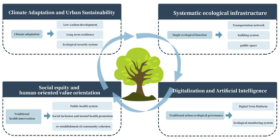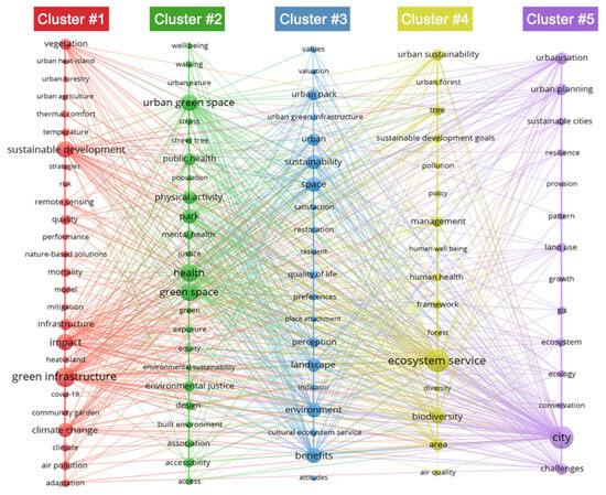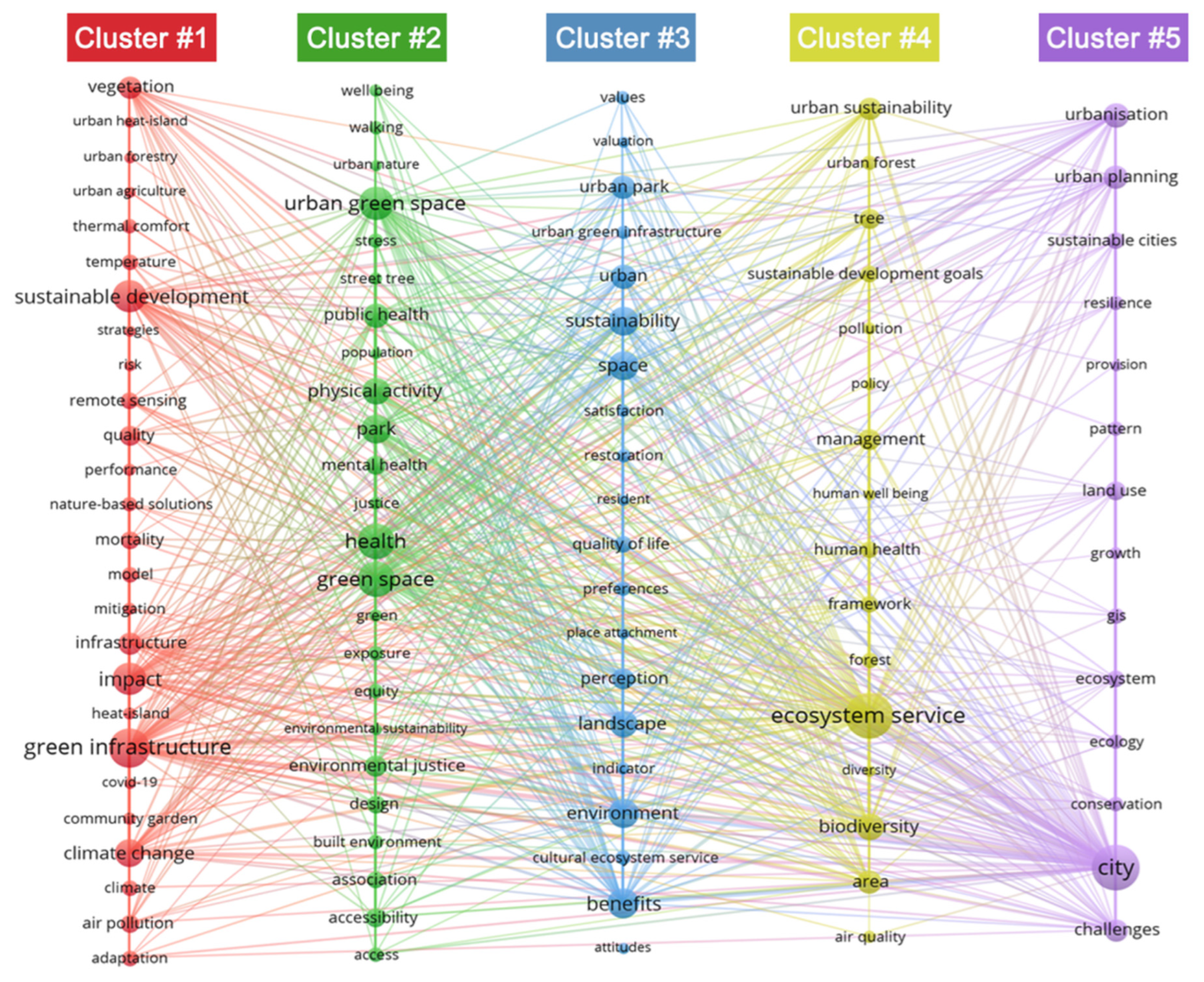 In summary, the five clusters collectively construct a thematic framework across five dimensions—climate adaptation, public health, quality of life, ecosystem services, and urban planning—reflecting the multidimensional coupling of nature–health–society–governance. Future research should further integrate the ecological, health, and planning dimensions to advance both the theoretical depth and practical transformation of sustainable healthy city development.