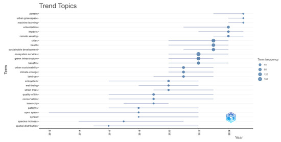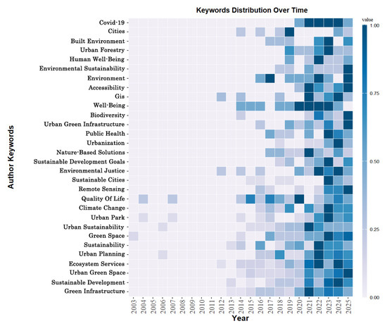 To reveal the thematic evolution and future trends in the research field of urban green space and sustainable healthy cities, we employed the Bibliometrix package (R) to conduct a time-series visualization of author keywords from the core literature, producing both a keyword heatmap (Figure 9) and a thematic trend map (Figure 10). The heatmap illustrates changes in keyword frequency over time, with darker colors representing higher frequencies. The thematic trend map integrates the time of first appearance, duration of activity, and intensity of frequency to depict the temporal dynamics and evolutionary pathways of research themes.
