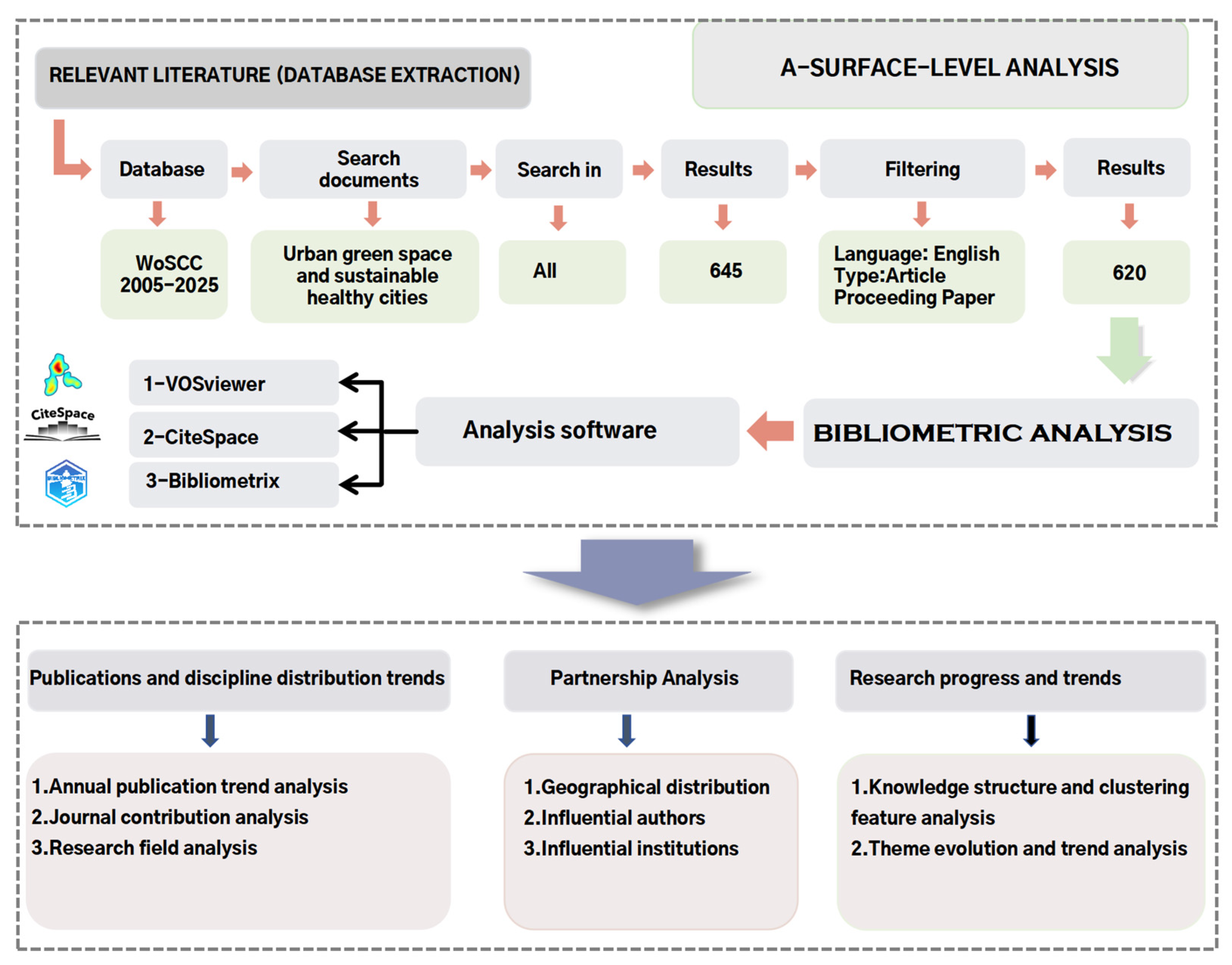Research landscape and collaboration network analysis: To systematically reveal the publication scale, disciplinary distribution, and evolutionary trends of research on urban green spaces and sustainability, and to identify the key countries, institutions, and authors occupying central positions and structural roles in the global collaboration network.