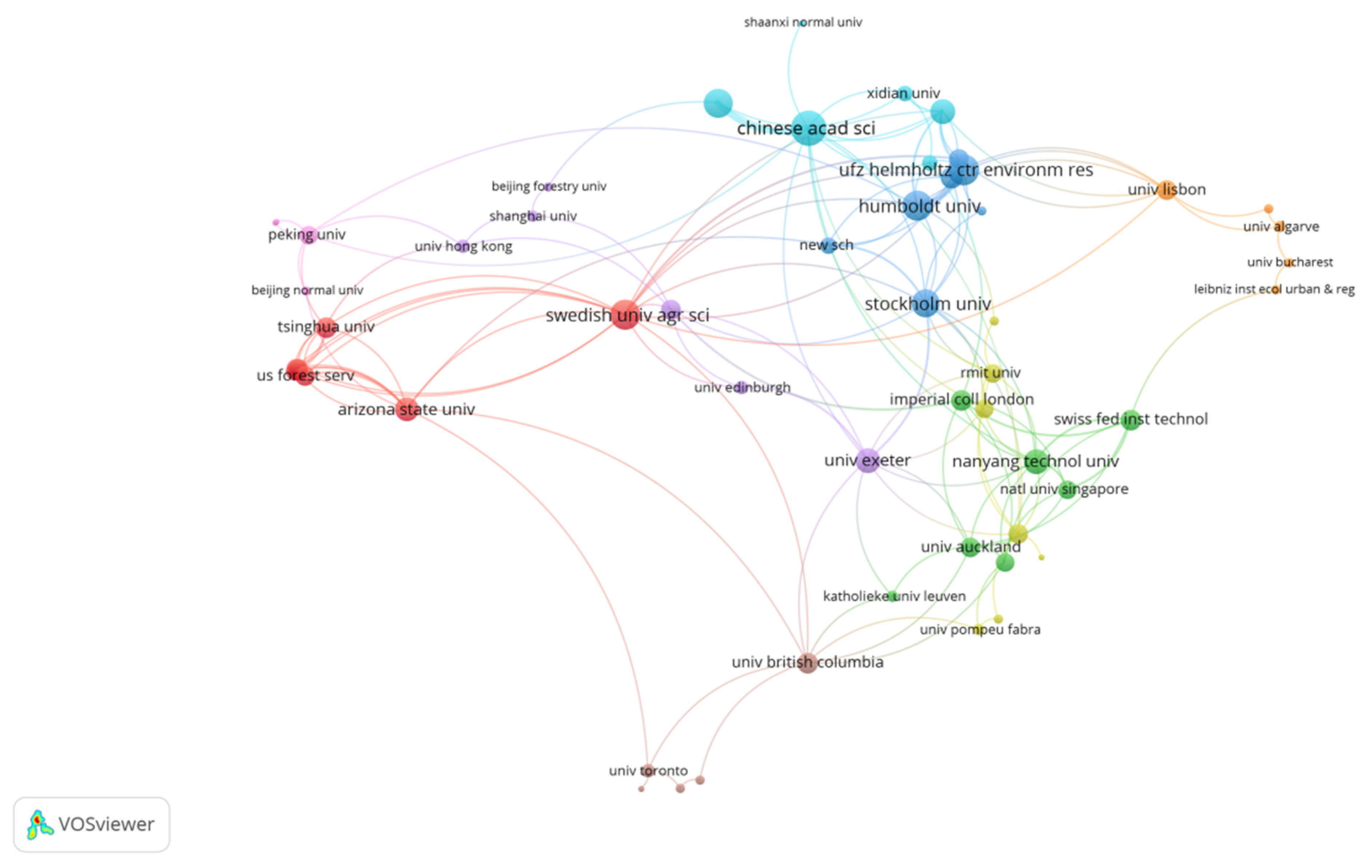 Another significant cluster is formed by Arizona State University, Swedish University of Agricultural Sciences, Tsinghua University, and the US Forest Service. This cluster highlights the research strengths of North America and Northern Europe in areas such as green infrastructure and urban ecosystem services. In particular, Arizona State University maintains extensive collaborations with multiple institutions, demonstrating a wide-reaching network and strong international influence.
