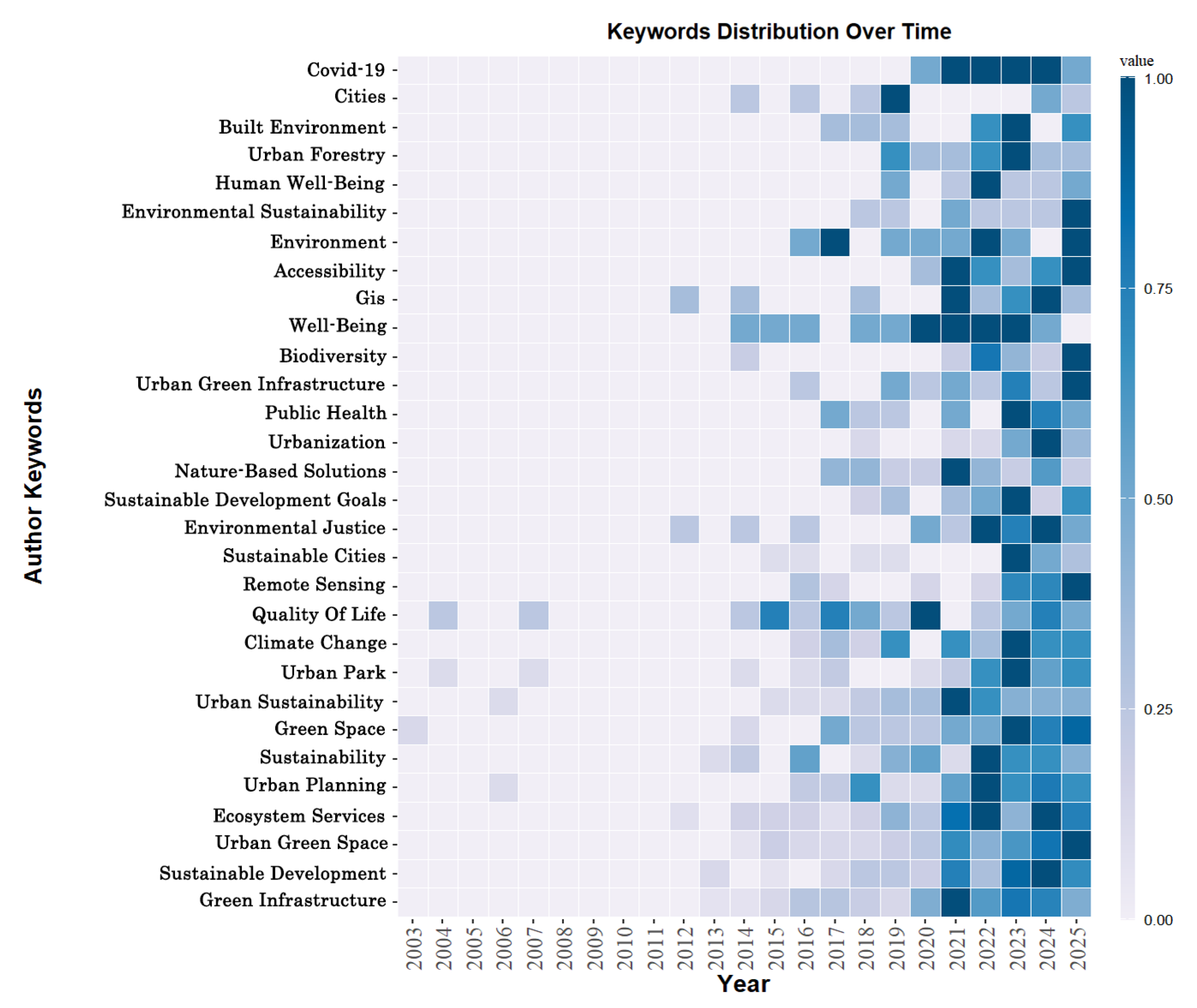 To reveal the thematic evolution and future trends in the research field of urban green space and sustainable healthy cities, we employed the Bibliometrix package (R) to conduct a time-series visualization of author keywords from the core literature, producing both a keyword heatmap (