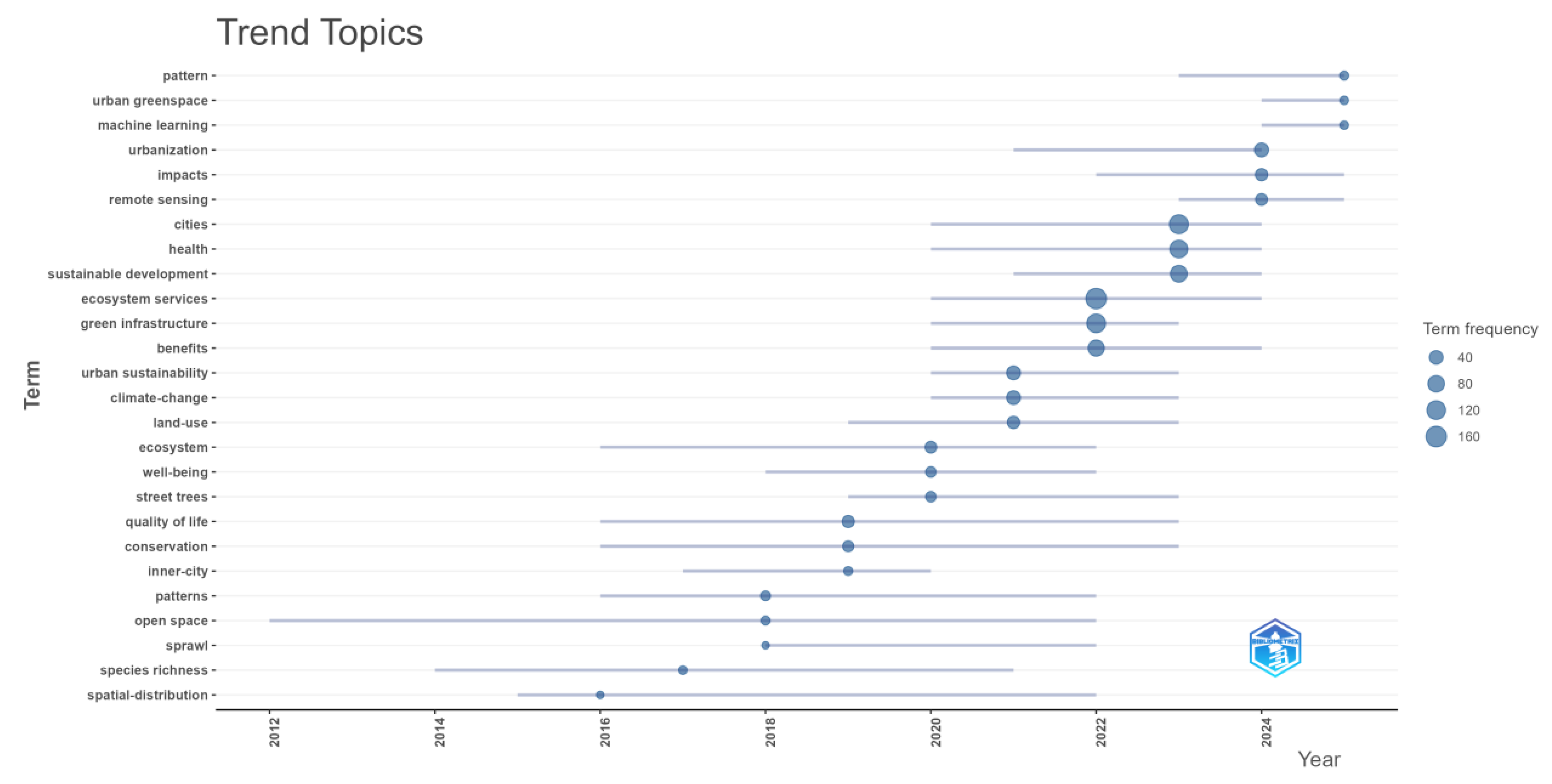 Figure 10) further reveals the evolutionary trajectory of research themes and the shifting academic focus in this field over the past decade. Along the timeline, early themes were dominated by ecological and spatial terms such as spatial distribution, species richness, sprawl, and open space. After 2018, topics such as urban sustainability, ecosystem services, and green infrastructure gradually emerged as research hotspots and have continued to attract sustained attention. Since 2020, keywords reflecting urban resilience, health, well-being, and digital technologies—such as health, remote sensing, and machine learning—have appeared with increasing frequency, indicating that the field is becoming deeply integrated with smart technologies and healthy city development. More recently, emerging themes such as pattern, urban greenspace, and machine learning suggest that frontier research is paying greater attention to multi-scale spatial patterns, data-driven approaches, and their applications in evaluating the health effects of urban green spaces.