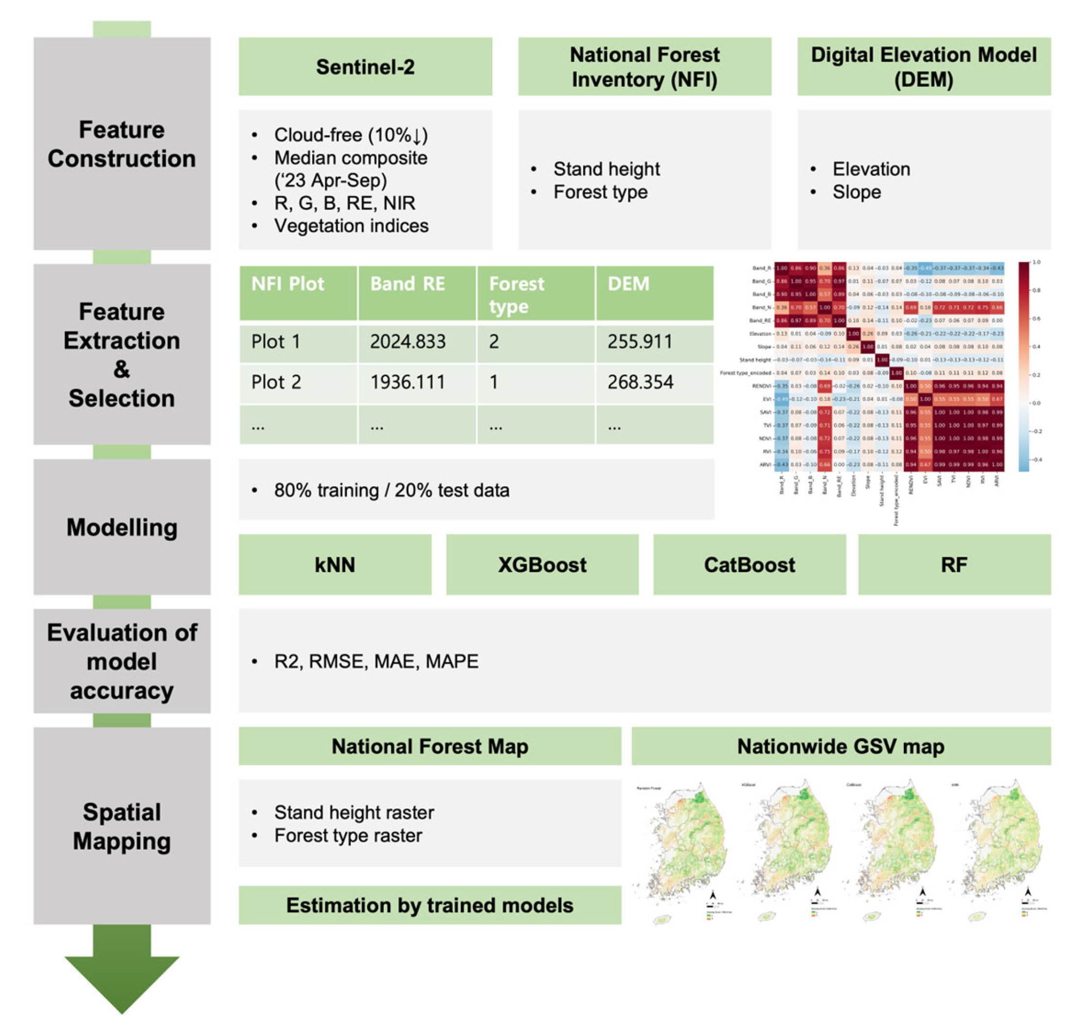 15]. Considering the complex mountainous terrain of South Korea, DEM-based predictors were included to complement Sentinel-2 spectral information and NFI attributes.