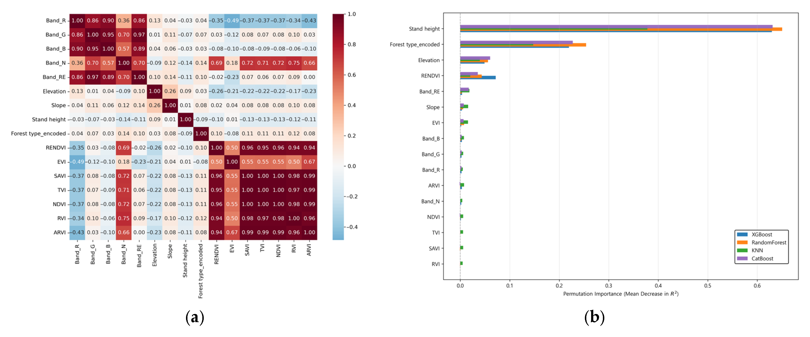 - Wang, D.; Xing, Y.; Fu, A.; Tang, J.; Chang, X.; Yang, H.; Yang, S.; Li, Y. Mapping Forest Aboveground Biomass Using Multi-Source Remote Sensing Data Based on the XGBoost Algorithm. Forests 2025, 16, 347. [Google Scholar] [CrossRef]