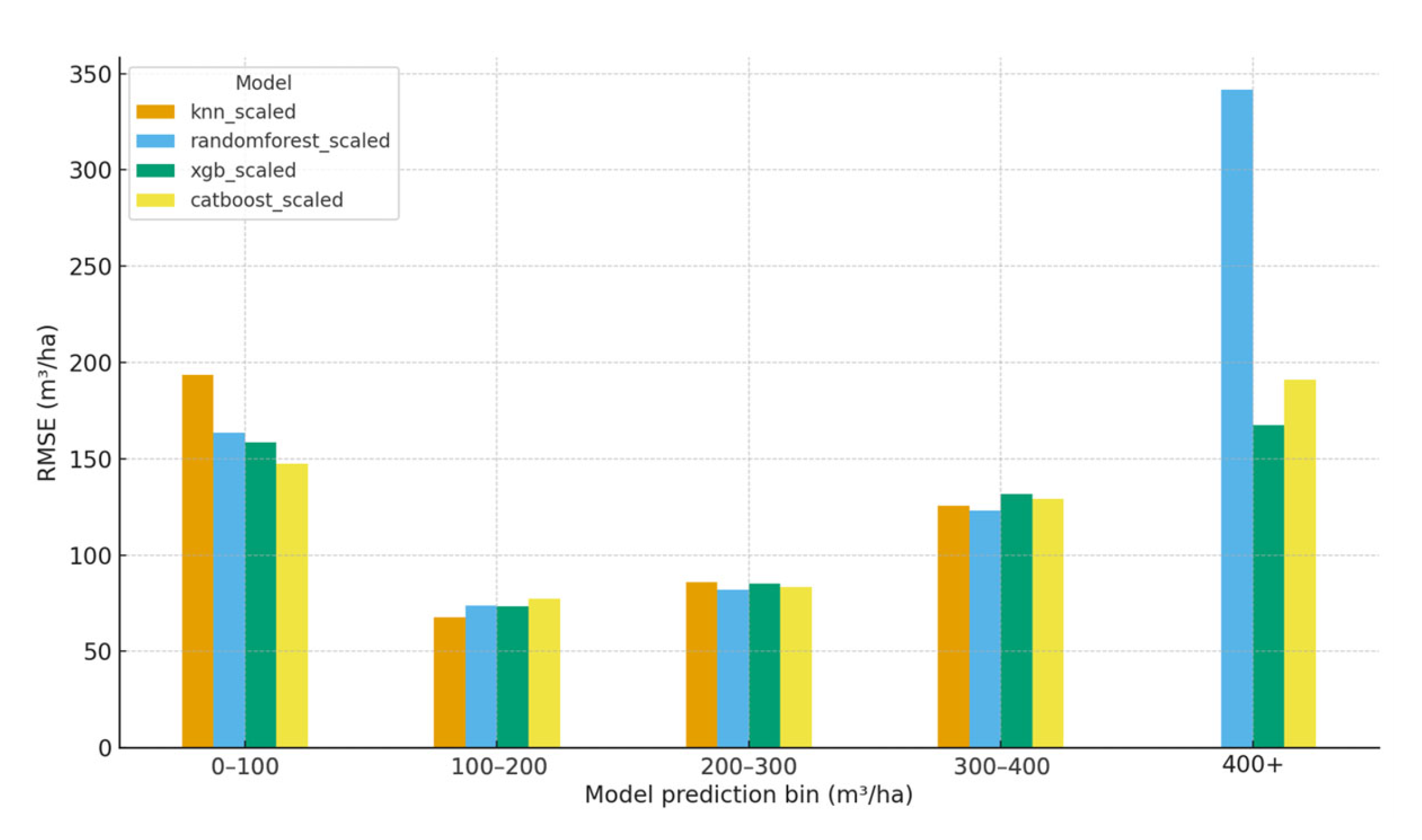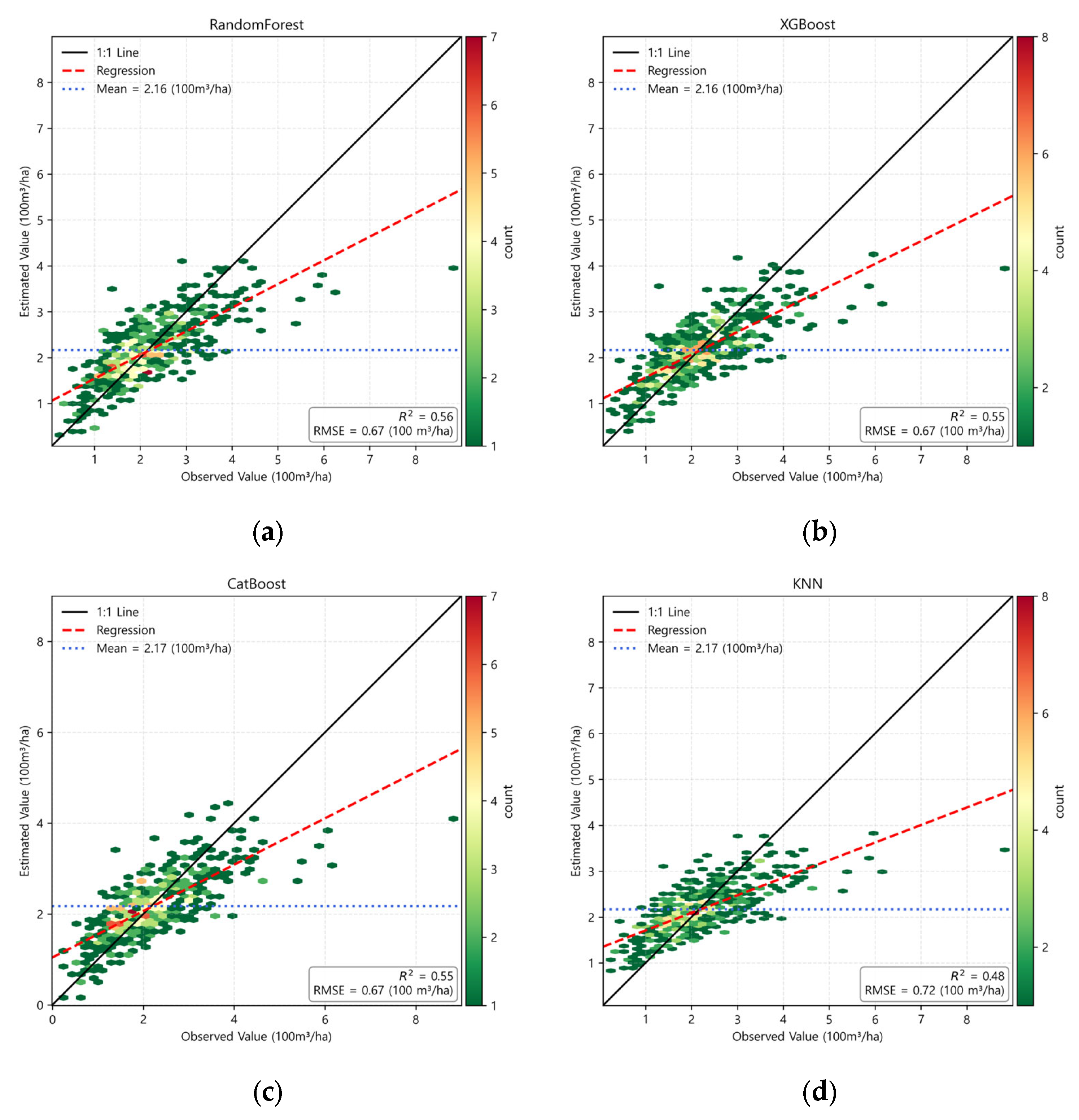 Figure 4) provide a visual comparison of model performance. RF, XGBoost, and CatBoost exhibited similar estimation patterns, with regression lines close to the 1:1 line. In contrast, the regression line for kNN had a lower slope, indicating a systematic underestimation of high-volume plots and greater dispersion, consistent with its weaker predictive accuracy relative to the ensemble methods.