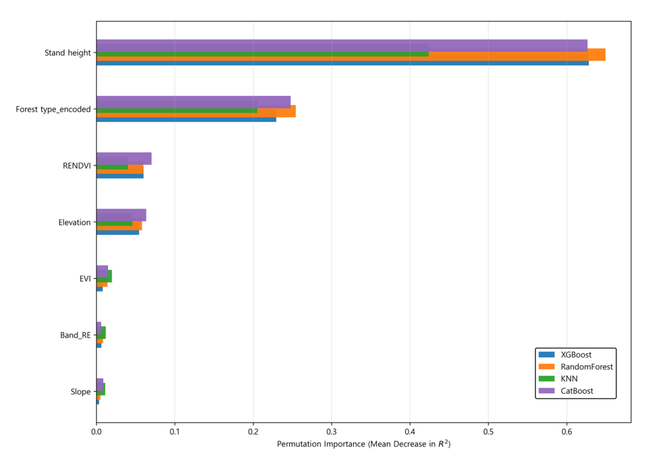Figure 5). Stand height was consistently the dominant predictor, producing the largest reduction in performance when permuted. Forest type ranked as the next most important variable, highlighting the role of species composition in explaining GSV variability. RENDVI and elevation had moderate contributions, followed by EVI. By contrast, the red-edge band and slope had minimal importance. The results suggest that structural attributes and categorical information were the strongest predictors, whereas vegetation indices and topographic variables provided complementary contributions.