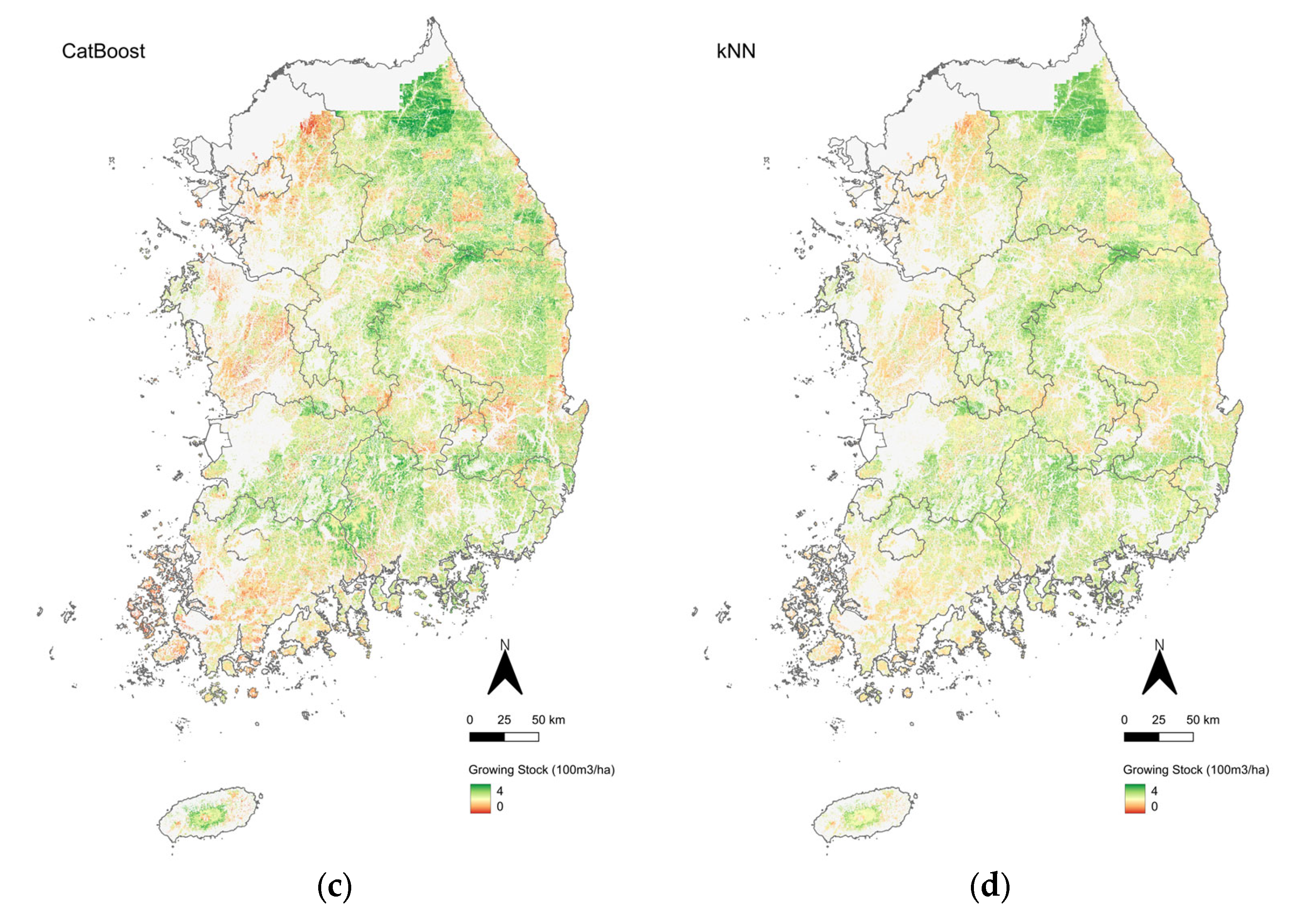 Trained models were applied to generate wall-to-wall estimations of GSV across South Korea. The final predictor layers (EVI, RENDVI, DEM, slope, stand height, forest type, and red-edge band), which corresponded to the independent variables used in model training, were prepared at a spatial resolution of 10 m and provided as inputs to the models. Although NFI attributes such as stand height and forest type are only available at the plot level, nationwide mapping requires spatially continuous layers. Consequently, we used rasterized stand height and forest type layers from the national forest map. These wall-to-wall datasets were then combined with Sentinel-2 indices and DEM-based predictors to generate nationwide GSV maps.