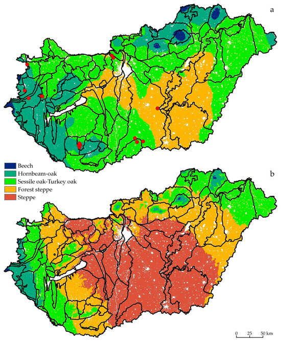 Map (a) shows the 69 major forest areas of Hungary, with color coding indicating the climate zones prevailing between 1981 and 2010. Red dots indicate the sampling sites from which the Turkey oak (Quercus cerris L.) samples were taken; the coordinates of the sampling sites can be found in Table 1 (image based on Illés et al. [28]). Map (b) shows the climate forecast for the period 2041–2070 using the same color coding as subfigure (a) [28].