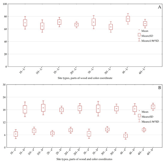 The results of the three-color coordinate measurements of the samples, sorted by site properties. The values of the coordinate points are shown on the Y axis and have no units of measurement. The abbreviations on the X axis are structured as follows: the serial number indicates the site types according to Table 1 (Nr. 1: Poor growing conditions, mixed stand; Nr. 2: Poor growing conditions, pure stand; Nr. 3: Good growing conditions, mixed stand; Nr. 4: Good growing conditions, pure stand); the second character indicates sapwood (S) or heartwood (H); after the hyphen, the color coordinate can be read as follows: (A) L*; (B) a* and b*. SD—standard deviation.