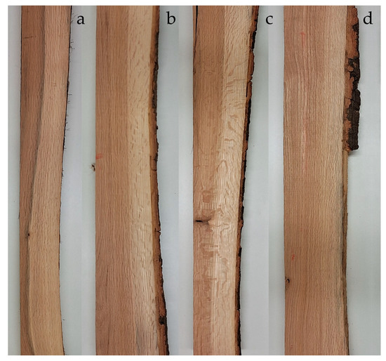 Images of typical test specimens after the color measurement (dried, planed middle planks). All of them originate from different types of growing sites in Kiskunság: (a) poor growing conditions, mixed stand; (b) poor growing conditions, pure stand; (c) good growing conditions, mixed stand; (d) good growing conditions, pure stand.
