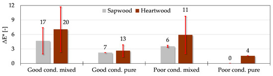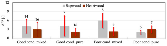 Average color differences characteristic of the four forest types, comparing individual trees at a single growing site separately for sapwood and heartwood. The standard deviation is indicated by the red line, while the numbers above the columns show the number of specimens used for the analysis. Abbreviations: Good cond. mixed—Good growing conditions, mixed-species; Good cond. pure—Good growing conditions, pure-species; Poor cond. mixed—Poor growing conditions, mixed-species; Poor cond. pure—Poor growing conditions, pure-species.