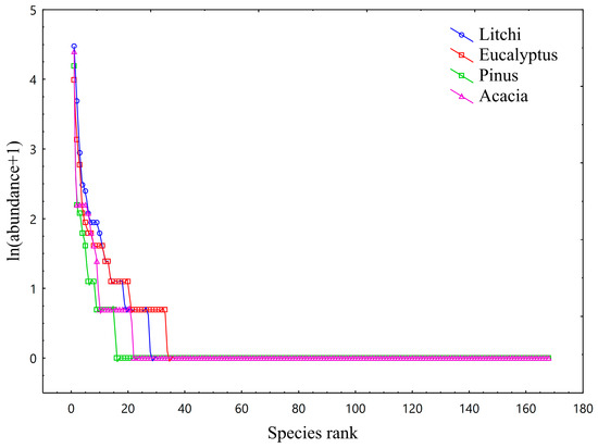 Rank-abundance curves of understory vegetation in the four plantation types. The blue curve represents the Litchi chinensis plantation, the red curve represents the Eucalyptus plantation, the green curve represents the Pinus massoniana plantation, and the purple curve represents the Acacia mangium plantation. The relative steepness of the curves reveals differences in community evenness. The flat slope of the Eucalyptus curve indicates higher evenness, while the steeper slope for Acacia mangium suggests greater dominance by a few species.