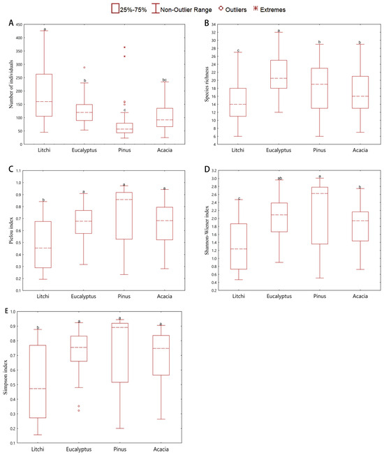 Boxplots showing the biodiversity indices of different close-to-nature transformed forests. (A) Individual number, (B) Species richness index, (C) Evenness index, (D) Shannon-Wiener index, (E) Simpson diversity index. Different lowercase letters show significant differences in the four close-to-nature transformations of the plantation (p < 0.05). The dots represent Mild Outliers, and the star-shaped symbols represent Extreme Outliers. The key overall finding is that the Litchi chinensis plantation consistently exhibited the lowest diversity and evenness, while the other three types showed varied and generally higher profiles.