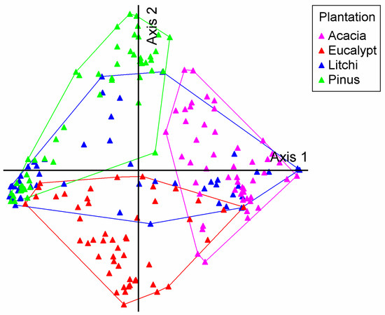 The DCA ordination revealed a clear pattern of understory community differentiation among the plantation types (Figure 3). A key finding was the strong segregation between the Eucalyptus, Pinus massoniana, and Acacia mangium plantations, with no overlap observed between Eucalyptus and Pinus massoniana, Eucalyptus and Acacia mangium, or Pinus massoniana and Acacia mangium. This suggests that each of these three plantation types has a highly distinct and specific understory community. Conversely, the Litchi chinensis plantation samples displayed a widely dispersed distribution that substantially overlapped with all other types, especially with Acacia mangium and Pinus massoniana. This indicates that the understory vegetation in Litchi chinensis plantations is less unique and shares considerable compositional similarity with the other plantations, possibly acting as a compositional intermediate or representing a more generalized habitat.