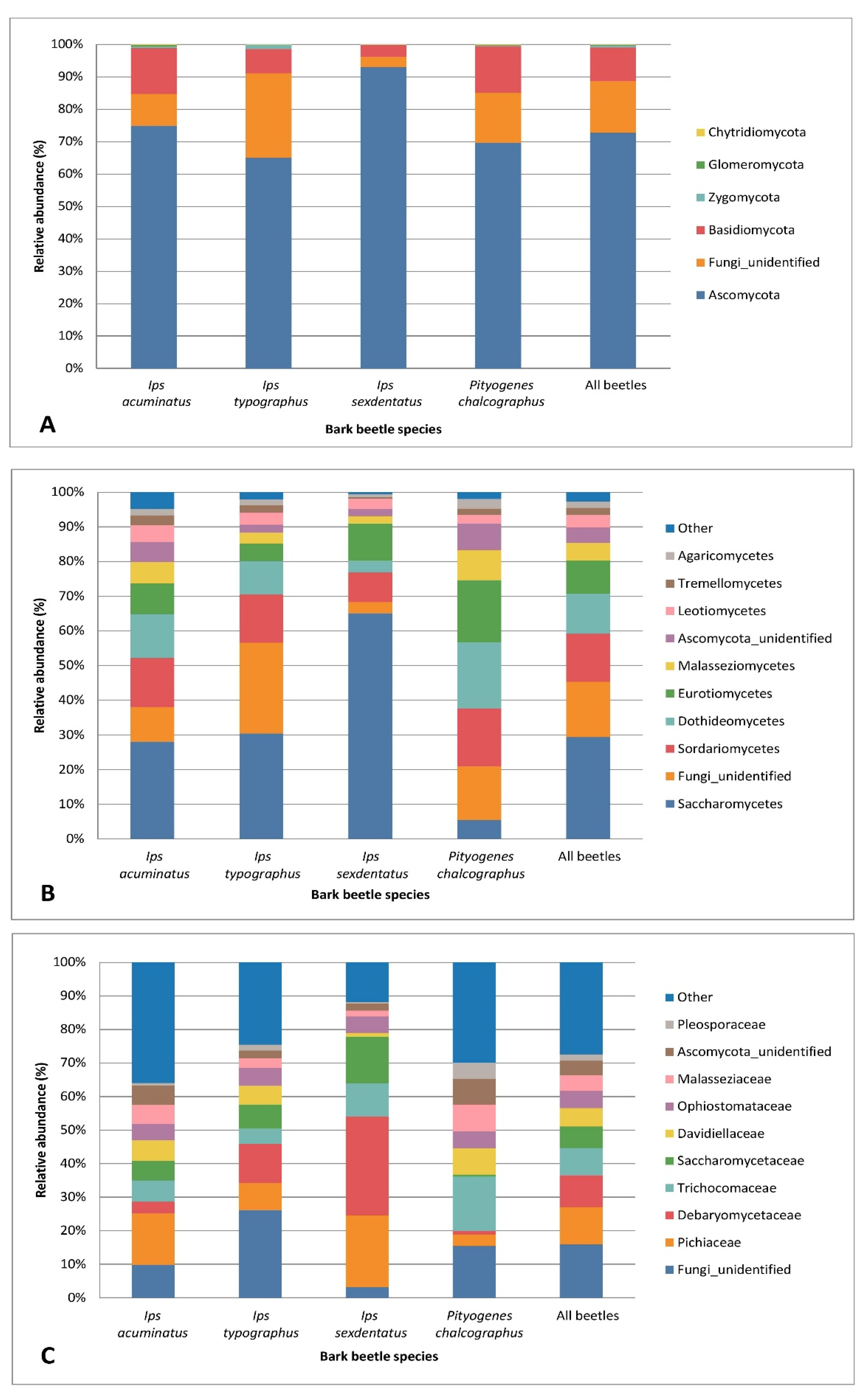 | Fungal OTUs Identified to Genus/Species Level | Ips acuminatus | Ips sexdentatus | Ips typographus | Pityogenes chalcographus | All Beetles |