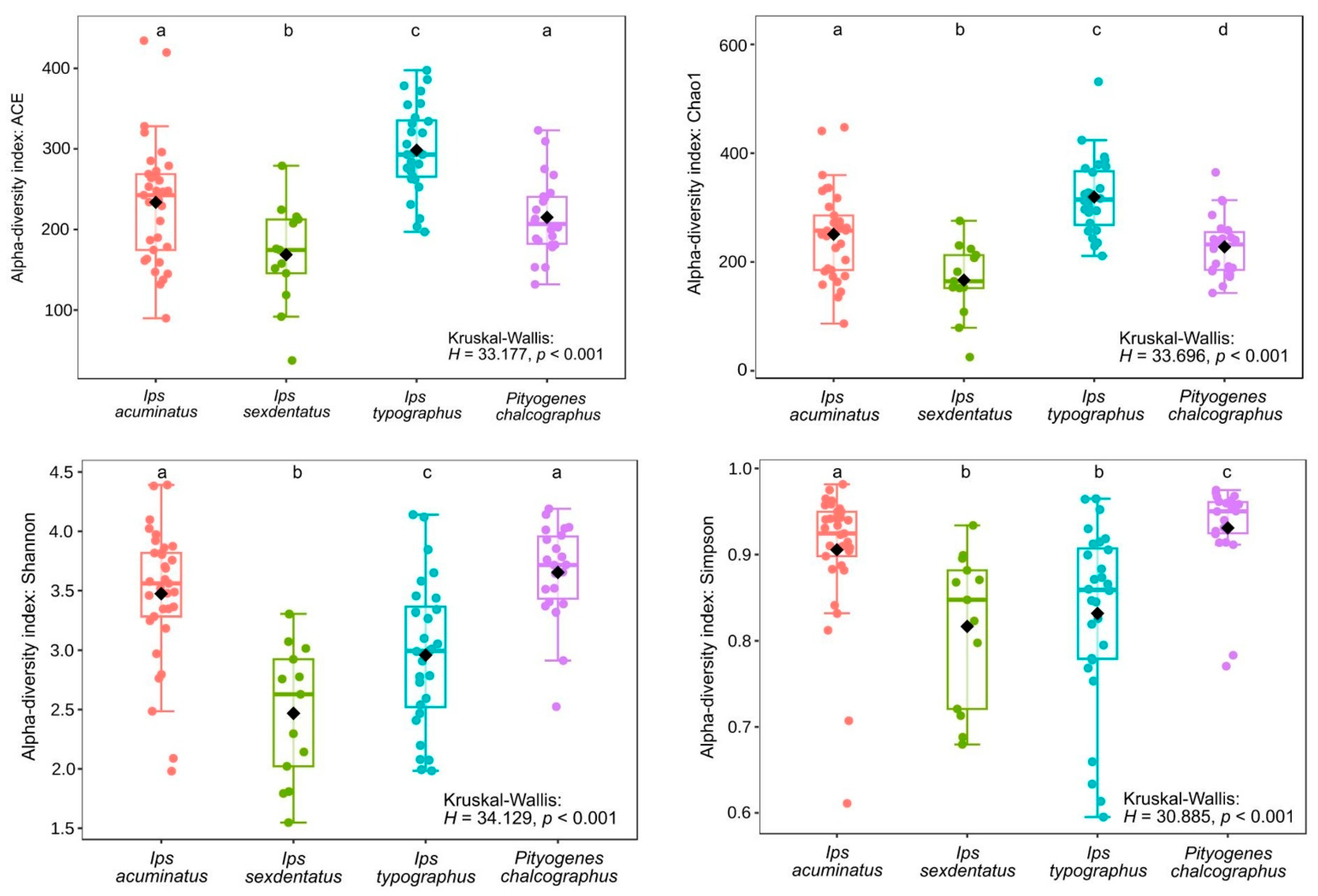 - Chakraborty, A.; Modlinger, R.; Ashraf, M.Z.; Synek, J.; Schlyter, F.; Roy, A. Core Mycobiome and Their Ecological Relevance in the Gut of Five Ips Bark Beetles (Coleoptera: Curculionidae: Scolytinae). Front. Microbiol. 2020, 11, 568853. [Google Scholar] [CrossRef]