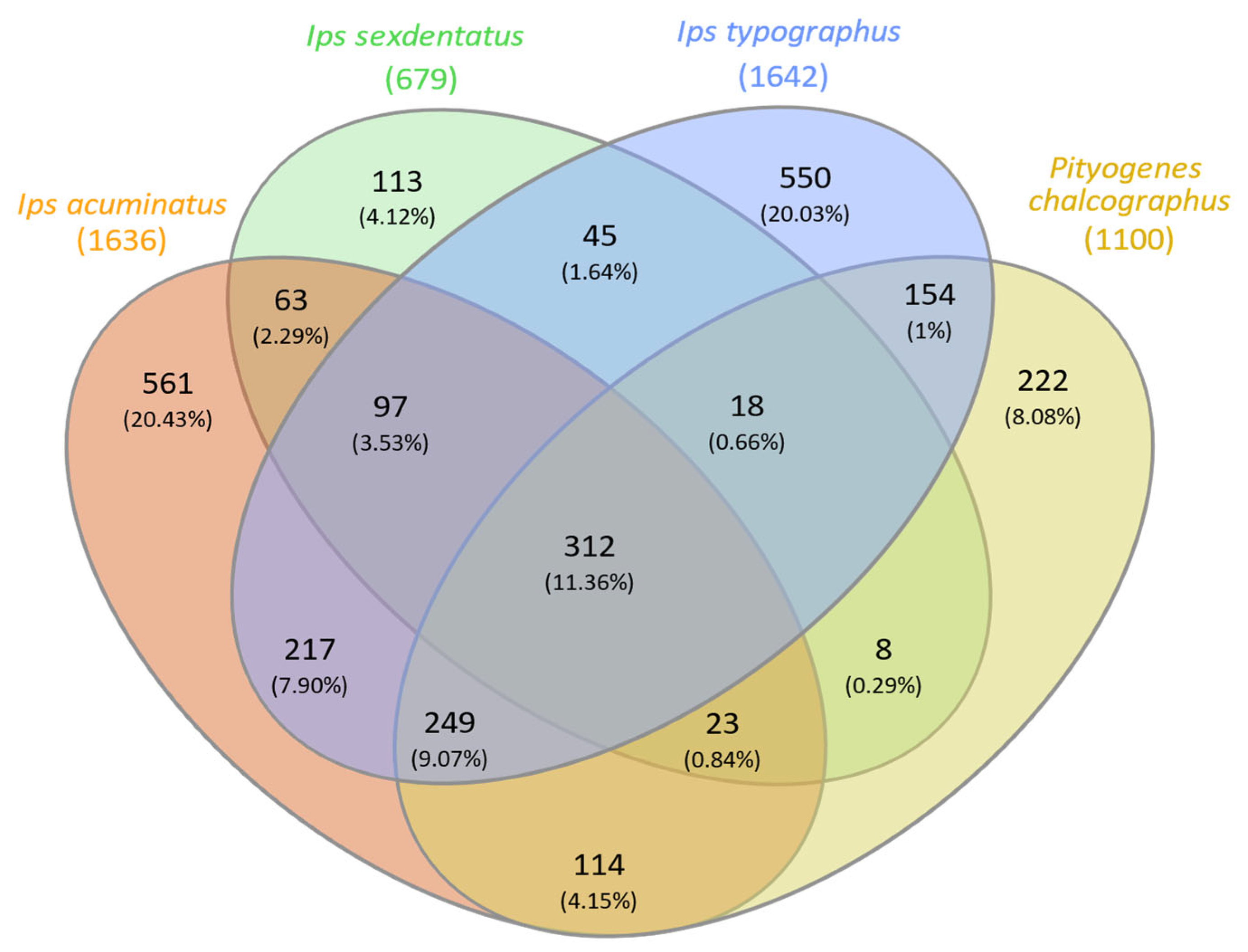- Cheng, T.; Veselská, T.; Křížková, B.; Švec, K.; Havlíček, V.; Stadler, M.; Kolařík, M. Insight into the genomes of dominant yeast symbionts of European spruce bark beetle, Ips typographus. Front. Microbiol. 2023, 14, 1108975. [Google Scholar] [CrossRef]