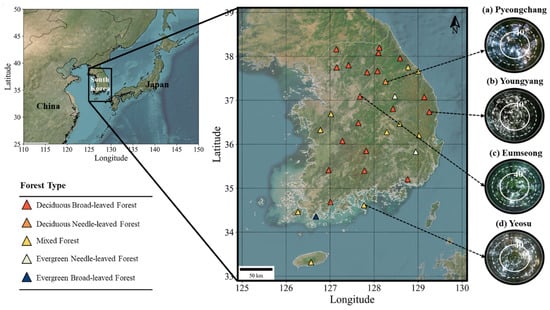 The network consists of 33 sites (Figure 1 and Table 1), covering different forest types: mixed forests (MF; 10 sites), evergreen needleleaf forests (ENF; 2 sites), evergreen broadleaf forest (EBF; 1 site), deciduous needleleaf forest (DNF; 1 site), and deciduous broadleaf forests (DBF; 19 sites). From the 33 network sites, four sites—Pyeongchang, Youngyang, Eumseong, and Yeosu—were selected for this study based on the available data period and forest type distribution in Korea. The dominant tree species at each site are as follows: Larix kaempferi (Lamb.) Carrière. in Pyeongchang; Quercus mongolica Fisch. ex Ledeb. in Youngyang; Castanea crenata Siebold & Zucc., Quercus mongolica Fisch. ex Ledeb., and Liriodendron tulipifera L. in Eumseong; Lindera erythrocarpa Makino, Styrax japonicus Siebold & Zucc., Quercus serrata Murray, and Pinus densiflora Siebold & Zucc. in Yeosu. The period for DHP imagery used in this study was April to December 2024 on selected sites.