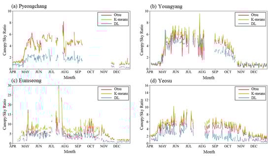 The canopy-to-sky ratio among different binary classification methods—Otsu thresholding (Otsu), K-means clustering (K-means), and deep learning (DL). (a) Pyeongchang, (b) Youngyang, (c) Eumseong, and (d) Yeosu.