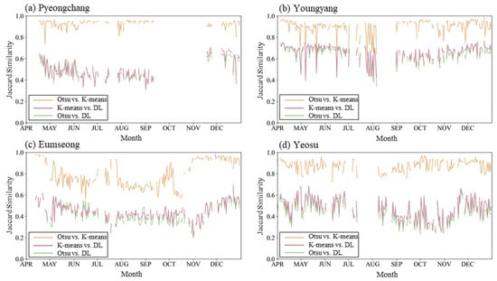 The Jaccard similarity among three binary classification methods: Otsu, K-means, and DL. (a) Pyeongchang, (b) Youngyang, (c) Eumseong, and (d) Yeosu.