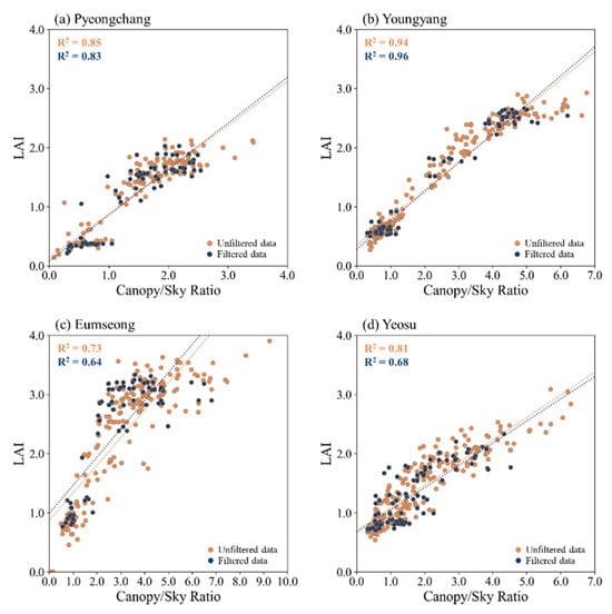 Comparison between canopy-to-sky ratio and LAI at four sites: (a) Pyeongyang, (b) Youngyang, (c) Eumseong, and (d) Yeosu. Orange points represent unfiltered data, and navy points show filtered data using TF14 (see Table 2).