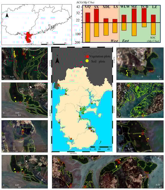 Two field surveys were conducted, in May 2022 and September 2022, covering a total of 60 plots (Figure 1), each measuring 10 × 10 m (Table 1), distributed across eight areas in Zhanjiang. During these surveys, detailed data on mangrove species and tree height were collected. Although the soil survey was conducted at the same time and in the same locations as the vegetation survey, the number of vegetation quadrats exceeded that of soil quadrats (55 samples) due to the labor-intensive process of collecting soil samples, which followed procedures outlined in previous studies [,]. Within each area, 2 to 4 plots, each measuring 5 m × 5 m, were selected to represent the primary mangrove communities in that specific area. A total of 55 plots were chosen across the 8 areas, with their respective geographical coordinates (longitude and latitude) and species names meticulously recorded. The primary mangrove communities identified included Avicennia marina, Aegiceras corniculatum, Sonneratia apetala, Kandelia obovata, Rhizophora stylosa, and Bruguiera gymnorhiza. All the geographical coordinates of soil and vegetation plots were monitored using the handheld GPS (UniStrong).