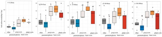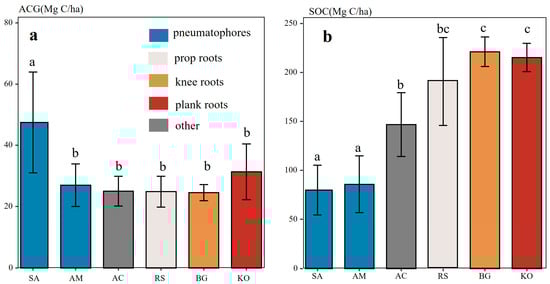 (a) Aboveground carbon stocks (ACG) of mangrove species with different root structures, and (b) soil carbon stocks (SOC, 0–100 cm). Species abbreviations: AM—Avicennia marina (Forssk.) Vierh.; RS—Rhizophora stylosa Griff. BG—Bruguiera gymnorrhiza (L.) Lam.; KO—Kandelia obovata Sheue, H.Y. Liu & J.W.H. Yong; AC—Aegiceras corniculatum (L.) Blanco; SA—Sonneratia apetala Buch.-Ham. Different superscript letters indicate significant differences among groups (p < 0.05).